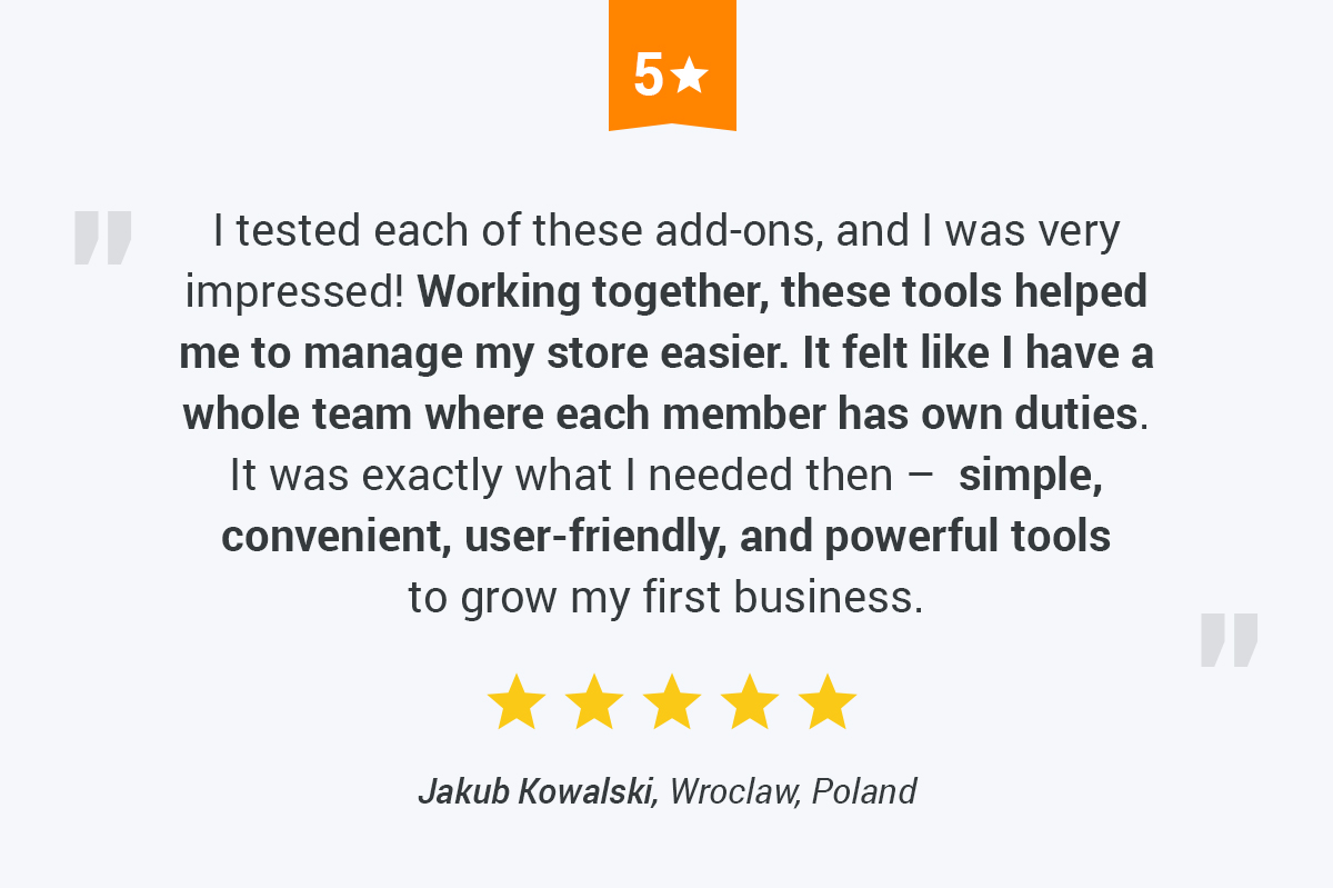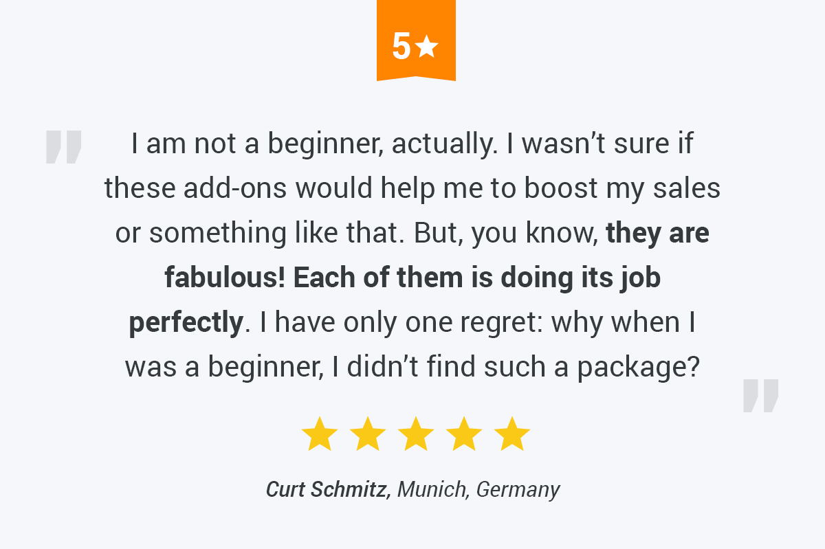 When you start your online business, you have to learn and study a lot. We want to make things easier for you! Get the dropshipping Beginner’s Set and let these six simple but powerful add-ons help you achieve awesome results faster! In this package, we’ve compiled add-ons which can help a dropshipping beginner tremendously: boost profit, work with reliable sellers, improve visitor trust, speed up performance and optimization, and run sales with ease.