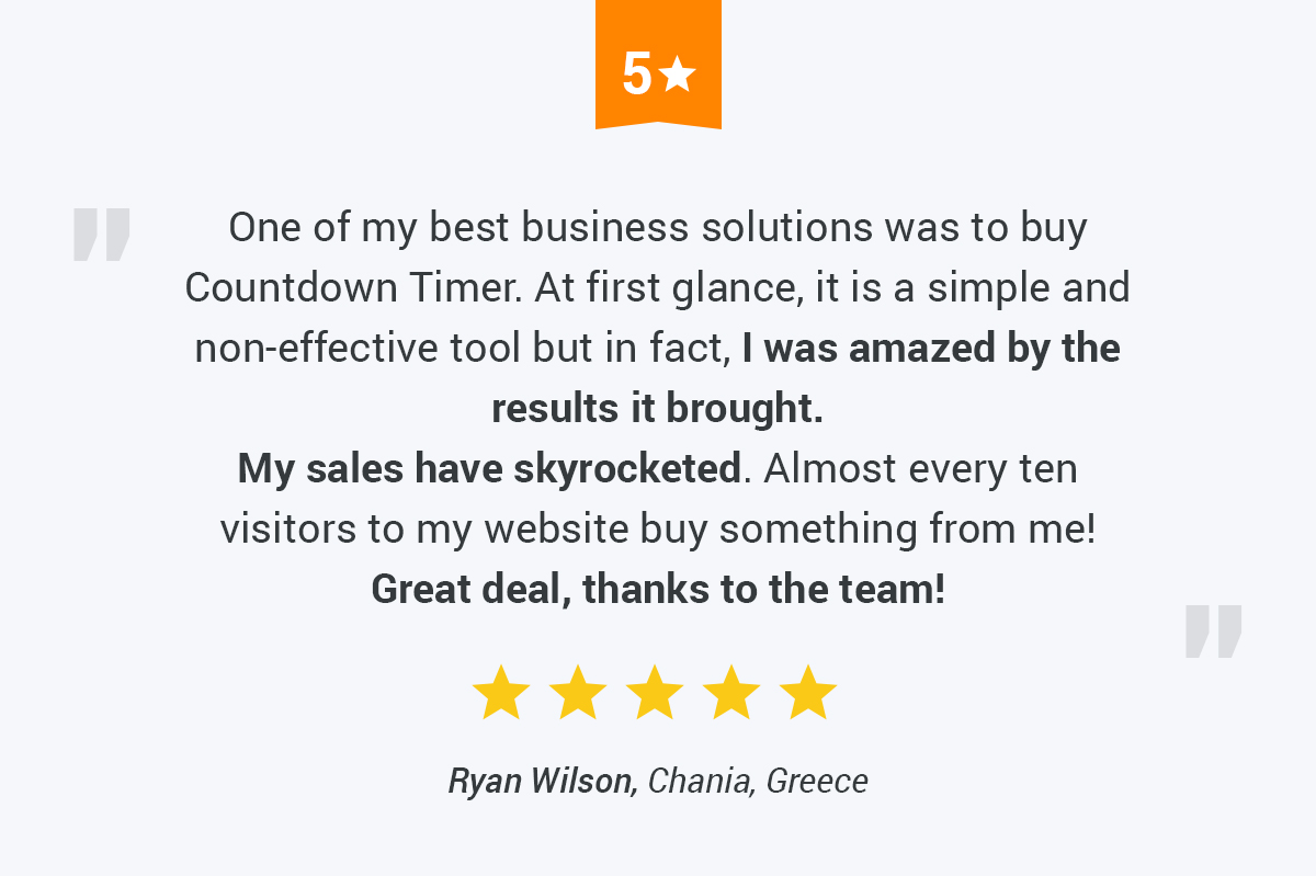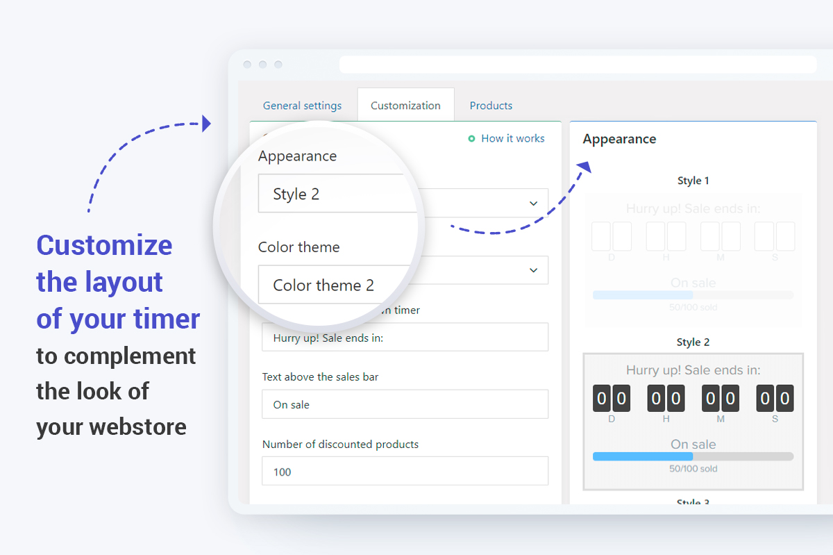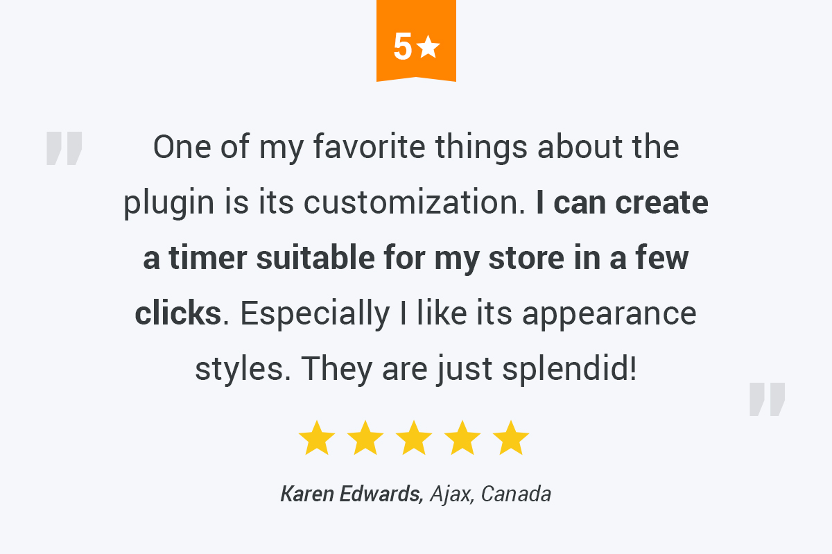 Thanks to easy customization, you can create a unique timer suitable to the look and feel of your online store. Choose from seven appearance options and six color themes, in addition to custom text options like font and color.