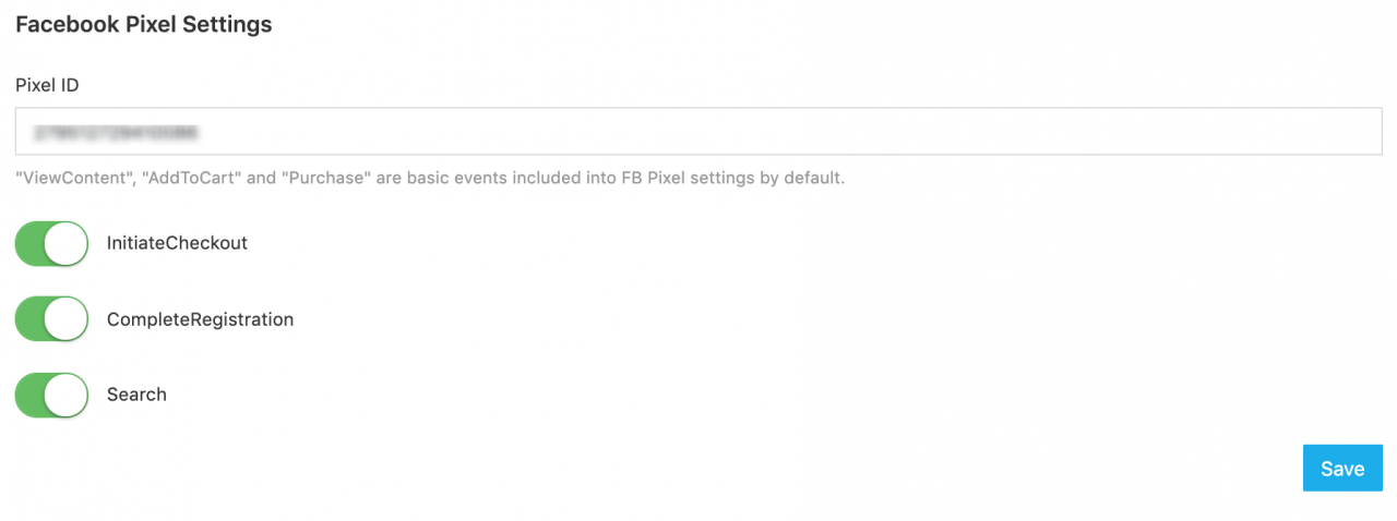 FB Pixel settings added (ViewContent, AddToCart, Purchase, InitiateCheckout, Search, CompleteRegistration events added)