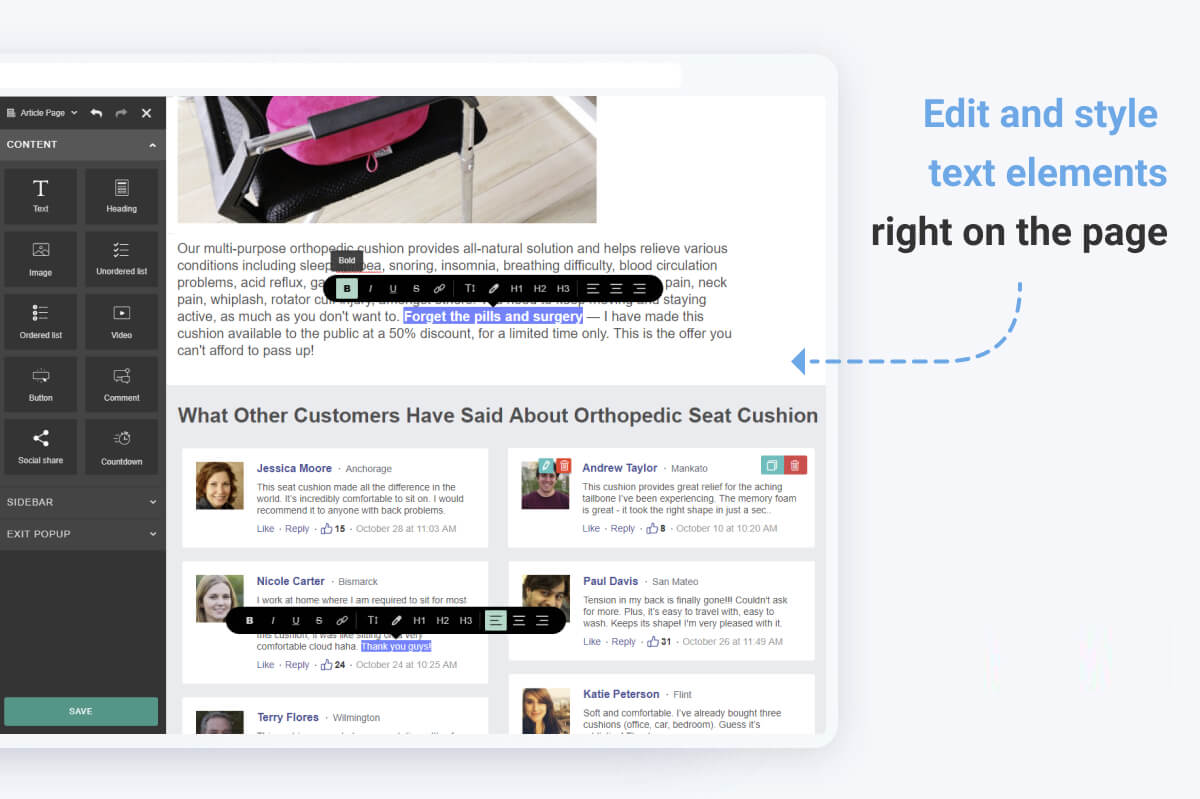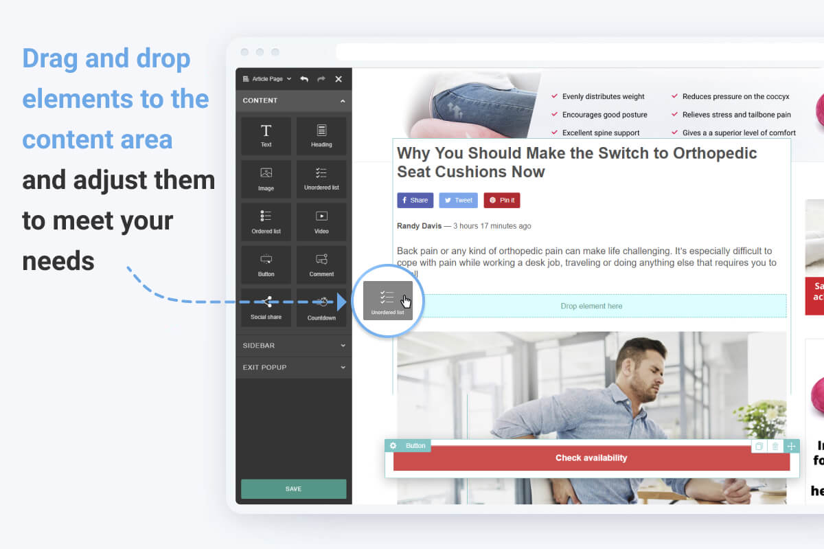 The pre-made templates you get with the Landing Pages add-on can be your starting point. We’ve developed our own flexible drag-and-drop builder you can customize your page with. Content elements are ridiculously easy to tailor: edit, delete, duplicate, and move them around the page with a couple of clicks. Add and edit paragraphs, visuals, lists, buttons, countdown timers, comments, and more on the fly to make the page look and act the exact way you want, and our builder will handle the technical stuff. You’ll see the end result of your work and how your landing page will look once it’s published without leaving the builder.