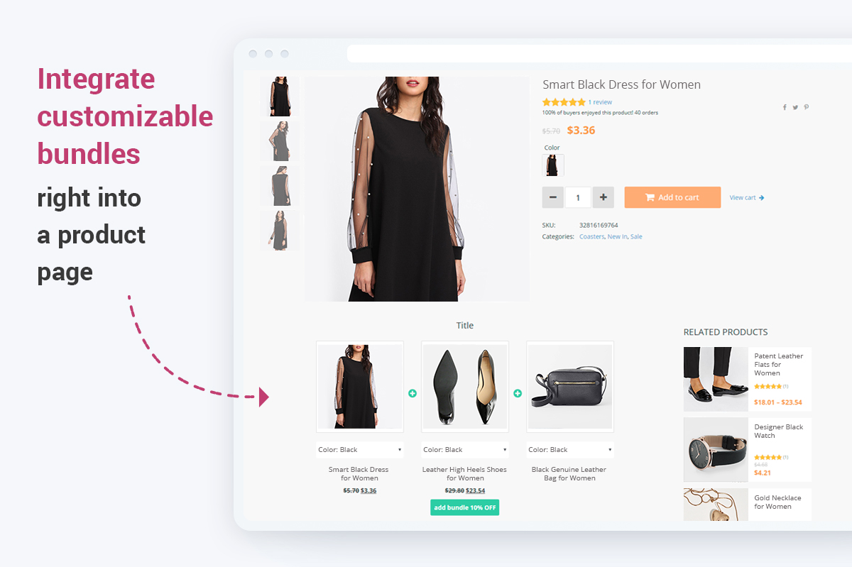 Right on the product page, your clients can select the desired variant and easily buy it with a good discount in a single click. Double the win!