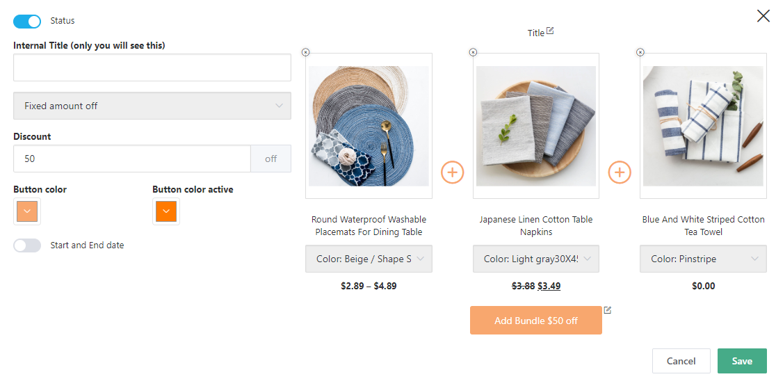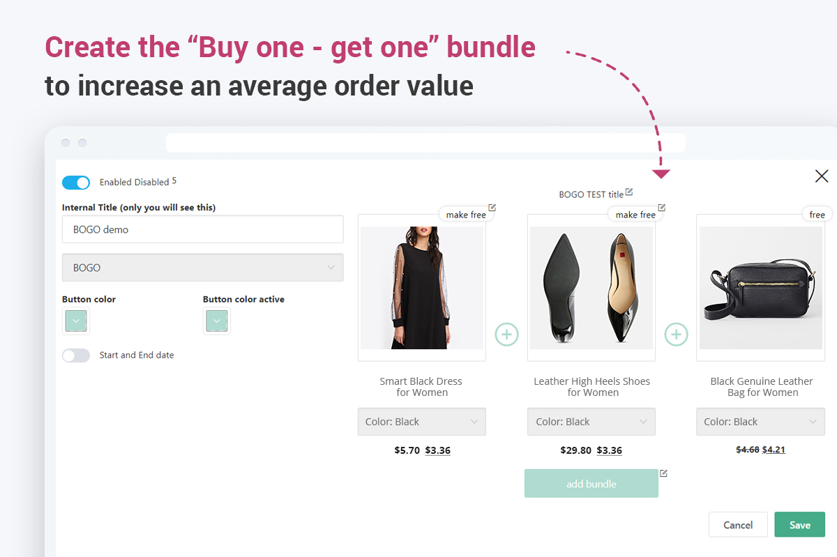 Select one of the five discount types, write your own text for the button, and click “Save” – just three simple steps to tempt your clients with hot offers. To make your marketing strategy even more flexible, you can schedule your product bundles in advance.