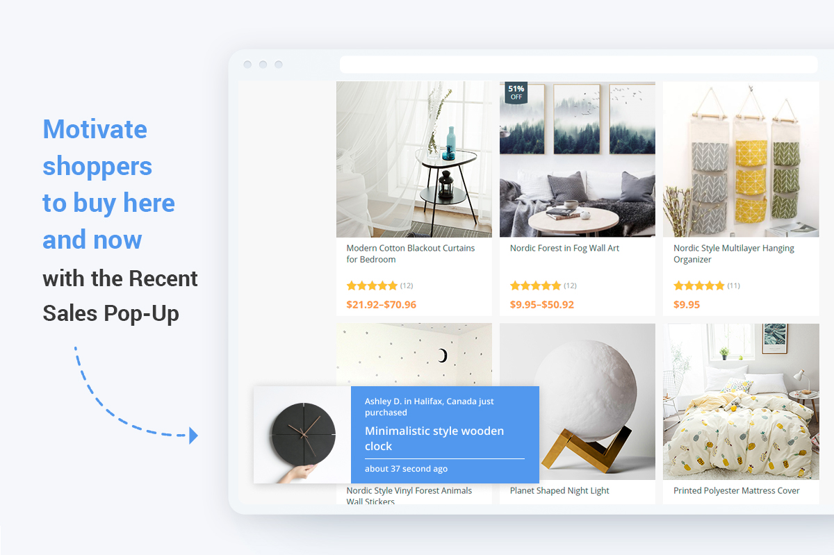 Our Recent Sales Pop-Up add-on kickstarts your profits, increases the trustworthiness of your store, and encourages people to buy from you!