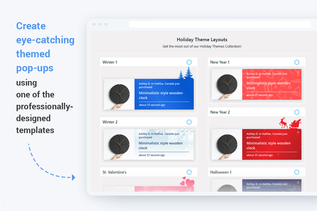 By selecting countries, names, and cities to display for, this tool gives you the power to smartly target your pop-ups. Your target audience will be confident that people just like them are buying from you!
