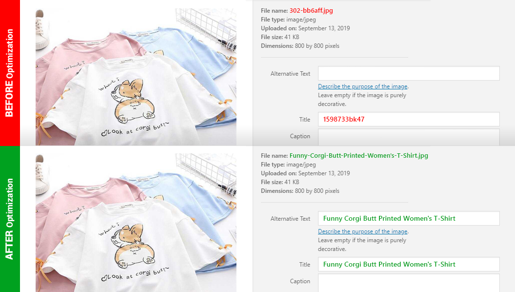 Images can be a great source of organic traffic for a store if the images are named correctly. Like ALT text, image file titles and file names need some love, too.
