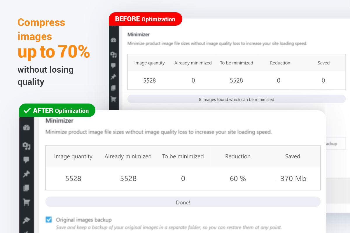 Included in this add-on is a handy Image Minimizer tool which compresses your images by up to 40-70% without any loss of quality. This helps to greatly increase your site’s loading speed (a significant factor in Google’s ranking algorithm) — this means higher ranking in search results and a zip-fast browsing experience for visitors.