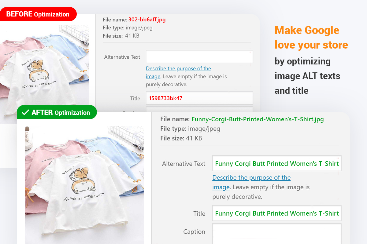 Alternate text (known as ALT text/tags) is crucial to search engine visibility of your website images. Each image uploaded on your store should have ALT texts. It makes your store more SEO-friendly and lets you get more traffic from image search. With the ALT Optimizer Tool (included in this add-on), you can automatically add optimized ALT texts to your images in just a second by using our templates or the ones you create by yourself.