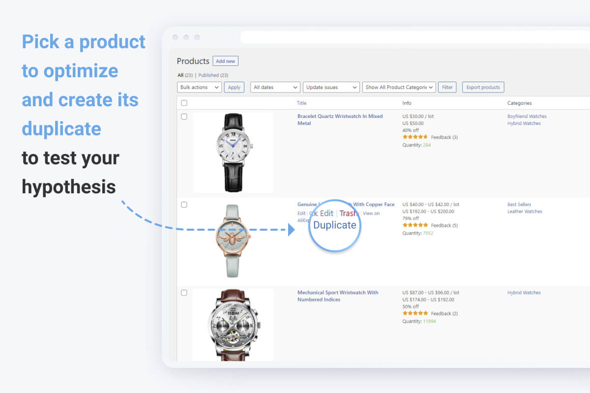 Set up an experiment just in a few moments to test your product hypotheses. The add-on will send each version to half your audience to see what converts better. For example, traffic is split 50/50 if you test 2 products against each other (i.e. 50% of users will see your original product, 50% will land on its variant). If you compare 4 products, each variant will get 25% of traffic.