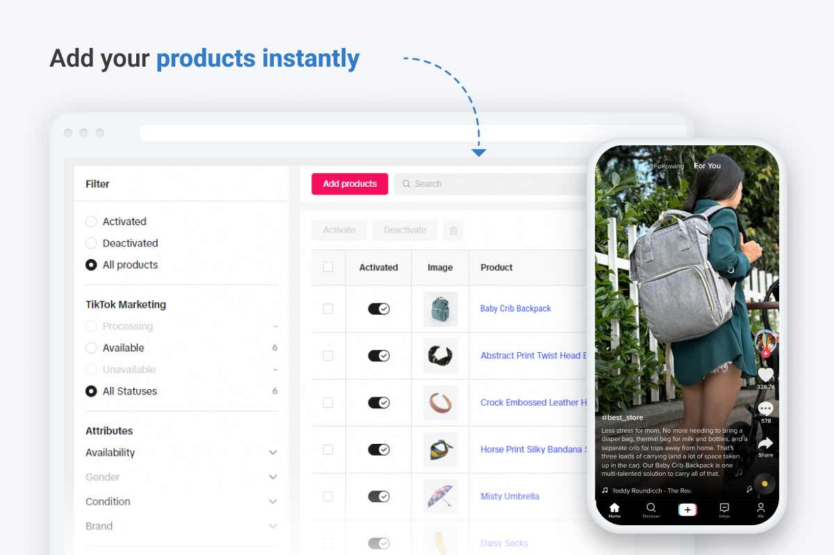 Did you know that 61% of TikTok users tend to make a purchase after they see an ad on TikTok? Make the best use of it with TikTok business add-on. Fuss aside, now you can seamlessly upload your products to your TikTok for business platform and connect TikTok Pixel to track the success of your ad campaigns.