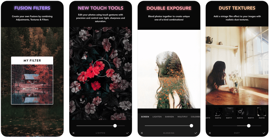 Edit like a pro with Afterlight’s user-friendly editing tools such as touch-gesture touch-ups, in addition to filter blending and effects such as color shift and overlays. Expand your creativity with 120+ hand-picked fonts for text and 150+ original designs from the developers.