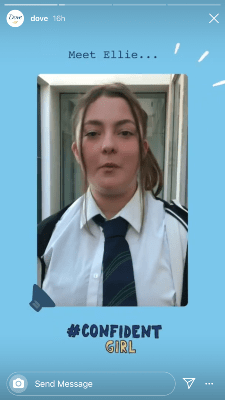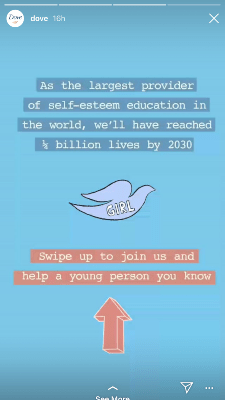 Is there a matter near and dear to your heart? Utilize Instagram Stories to bring awareness to a social or environmental issue. Dove shined the spotlight on a young girl named Ellie as part of its Dove Self-Esteem Project, which aims to bring body positivity to young women around the world. You can see how the health/beauty brand fused animated text, video, and a simple template together to create an easy-digestible yet impactful story. There is also a mention in the story of a feed post for viewers to learn more (in the post caption), plus a swipe-up CTA to the project’s landing page.