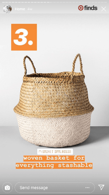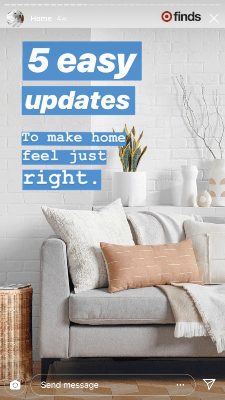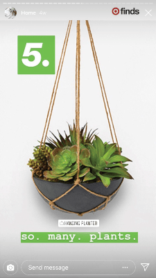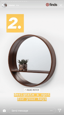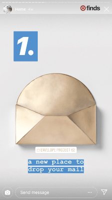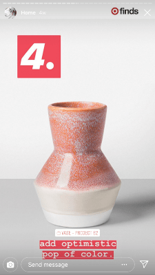 Target tells an engaging step-based shopping guide for customers to learn how to accessorize their home. Utilizing a simple layout and bright text box colors, Target showcases top-pick items with built-in shopping links, allowing users to buy the decor shown. There’s also an ending page with a CTA to swipe up and visit a landing page.The chronological layout of Instagram Stories makes perfect for numerical tap-through experiences such as this.