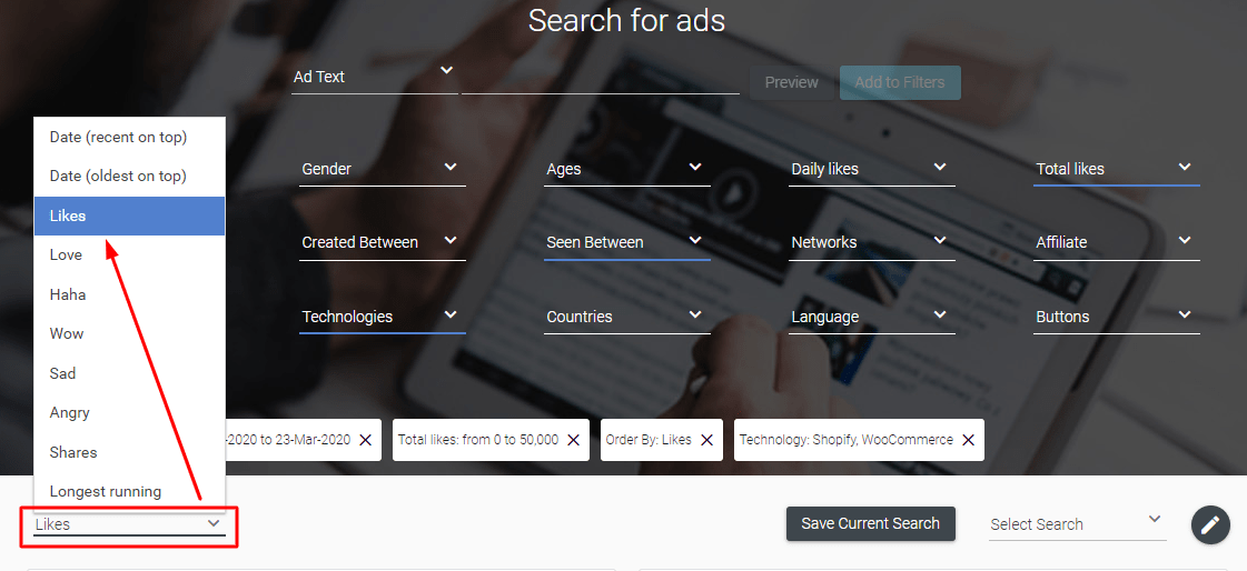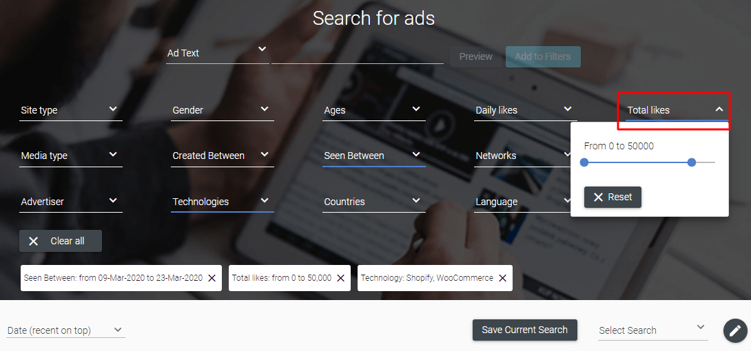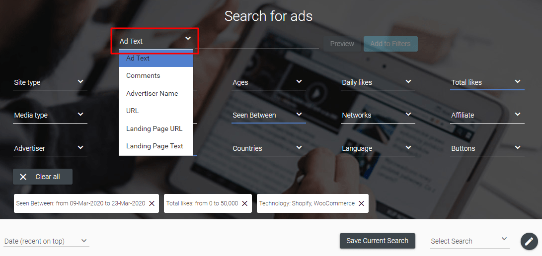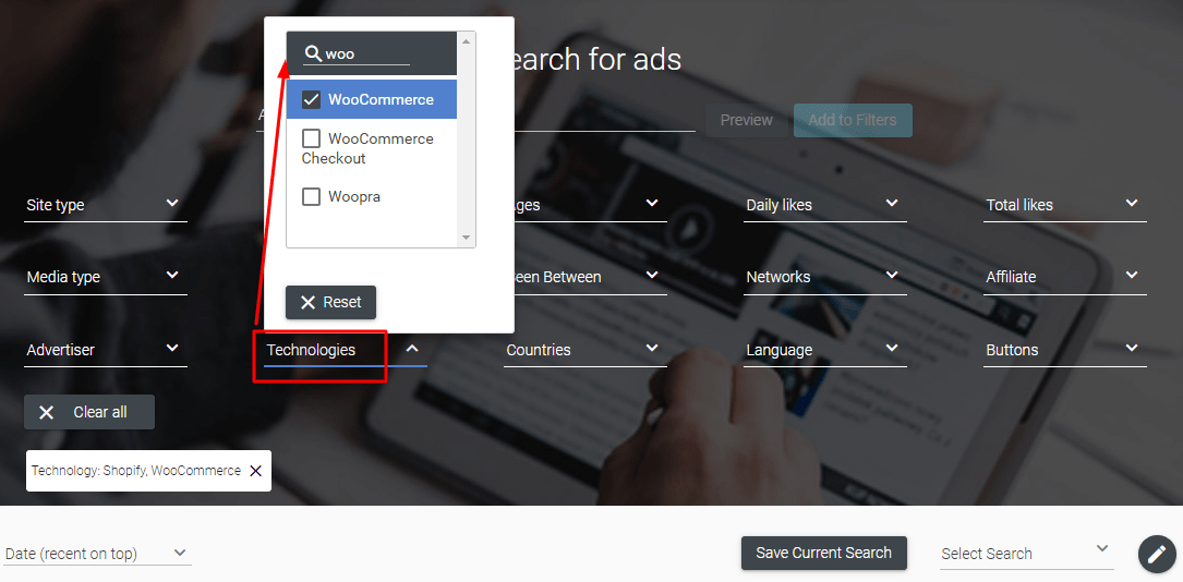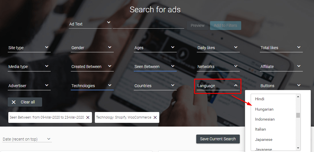This filter can hide all ads that come from any platforms except the ones you choose. Here I picked Shopify and WooCommerce, so I’m going to see only ads created by ecommerce stores built on these platforms.