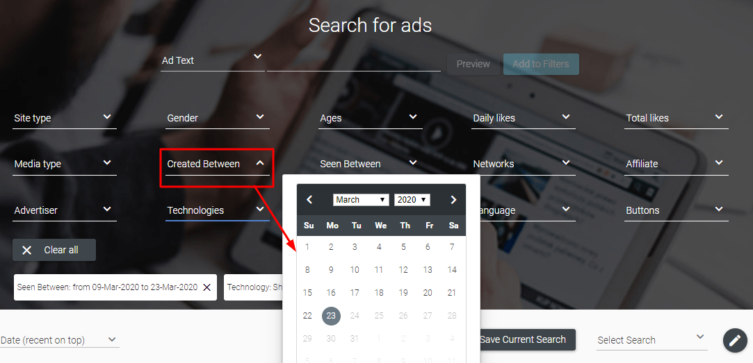 Unlike the previous filter, this one will show me only those ads that were created during a given period of time. In theory, such ads reflect the latest trends better than the Seen Between filter. However, if you see a newly created ad, it doesn’t necessarily mean nobody made similar ads before.