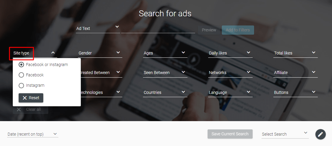 This filter lets you toggle between ads on Facebook and Instagram, but the default settings show both of them. Since both these social networks work great for ecommerce business, leave it as it is.