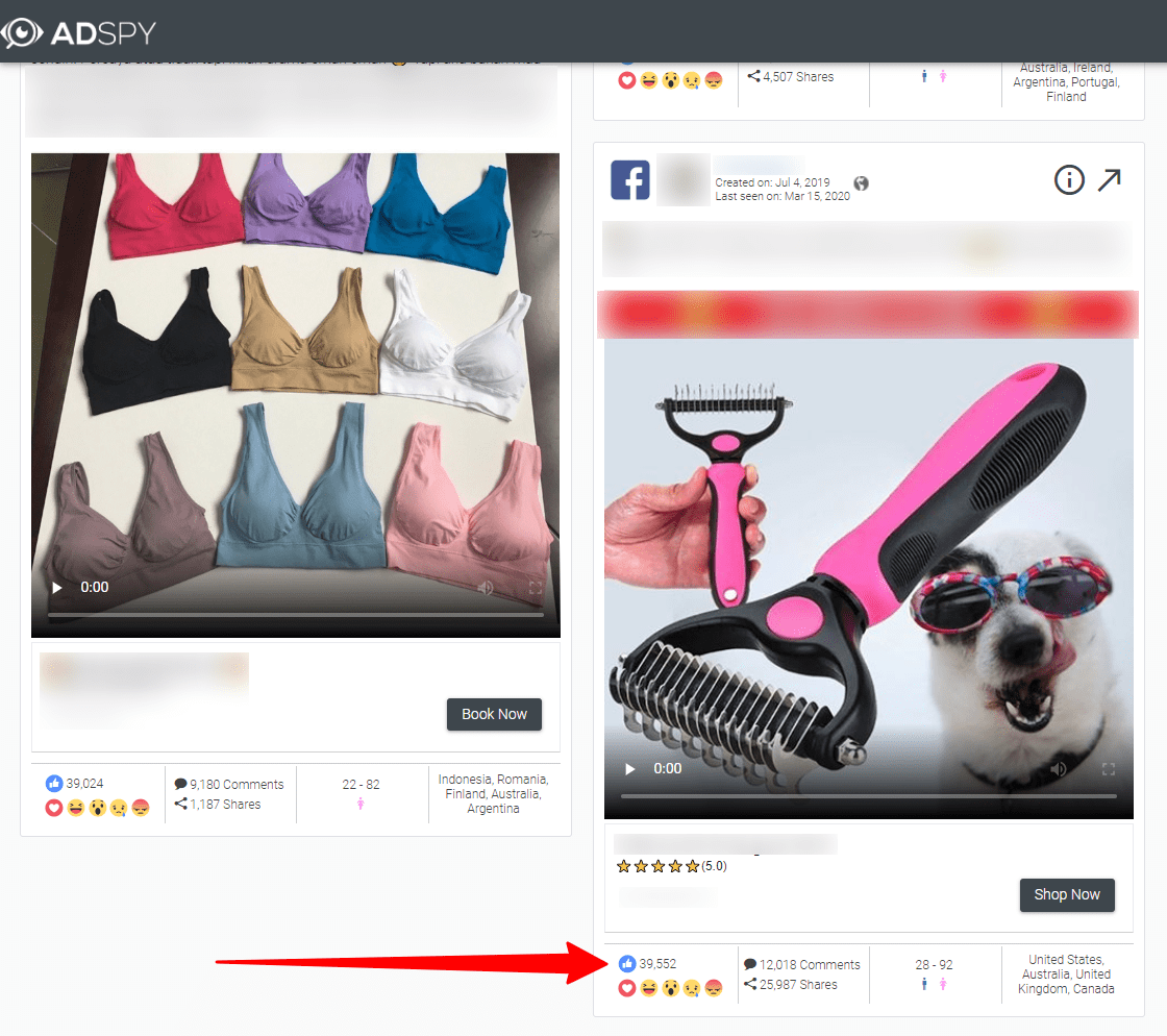 After setting up all these filters, AdSpy will show a long list of ads. Most of them will probably not suit you for different reasons. For example, I found quite a number of ads promoting shoes, but I don’t want to take such a risky product.