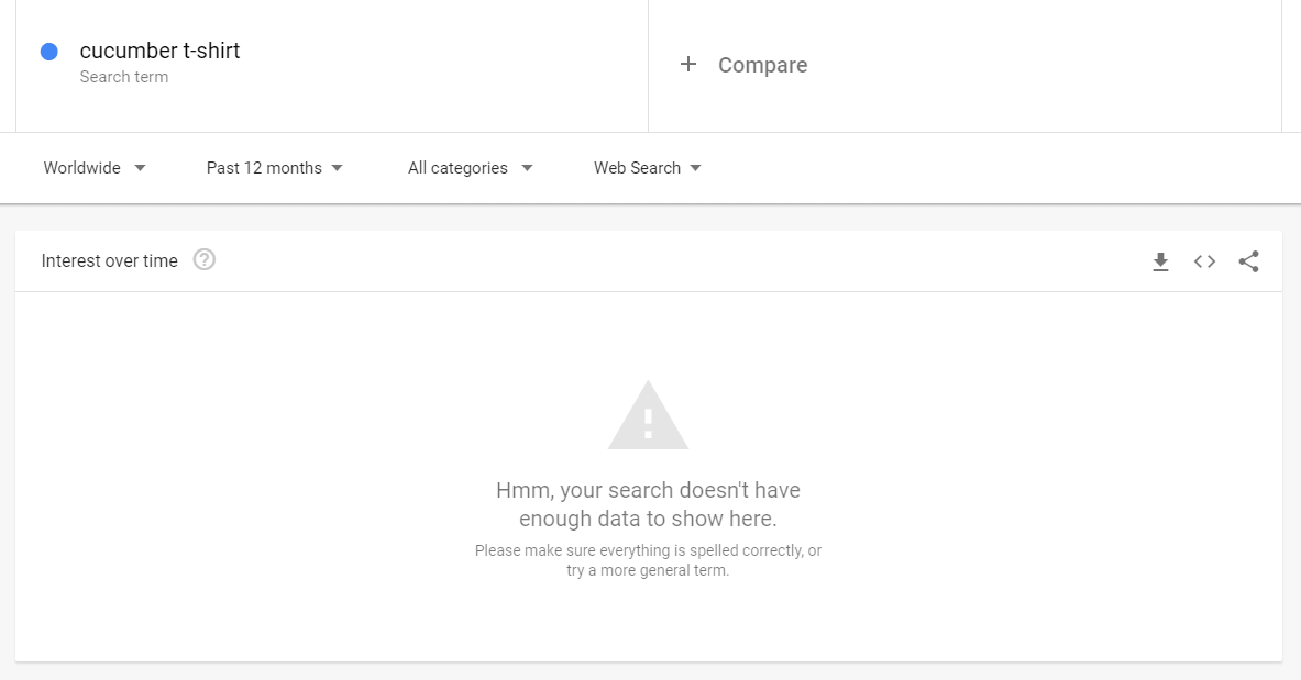 Note that Google Trends works well with more or less general queries and will hardly help with very specific ones. For example, my attempt to input “cucumber T-shirt” completely failed. But it doesn’t mean such T-shirts couldn’t sell well, so don’t expect Google Trends to be helpful all the time.