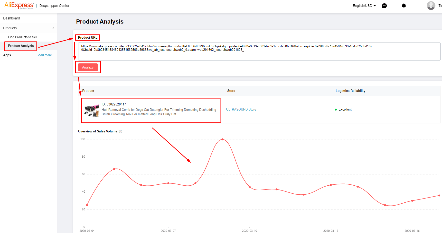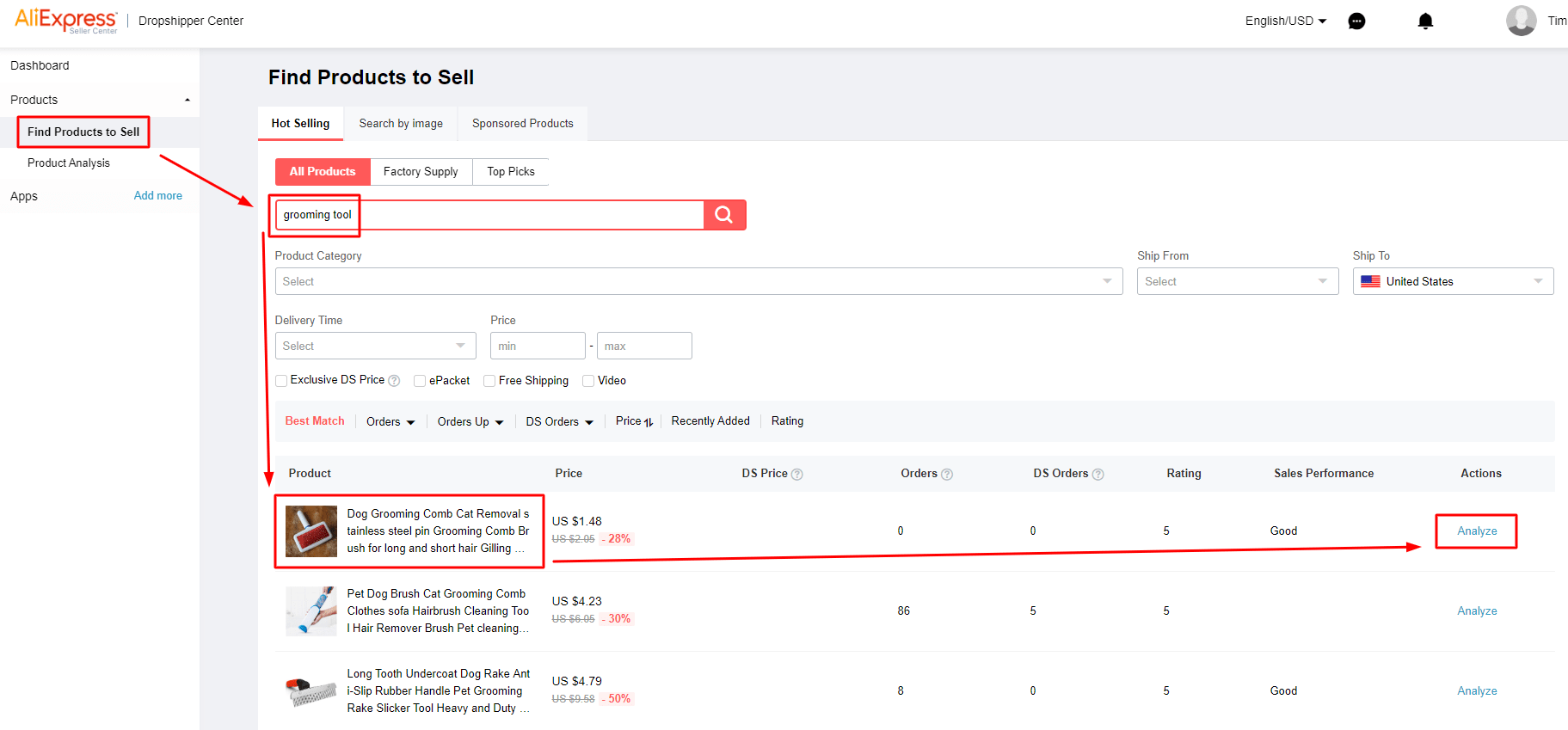 The first one is to find products by a keyword. It’ll show you lots of similar goods which you can sort by the number of sales, rating, price, etc. There’s also a number of helpful filters. When you find something interesting, click on the Analysis button.