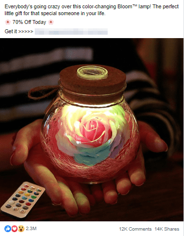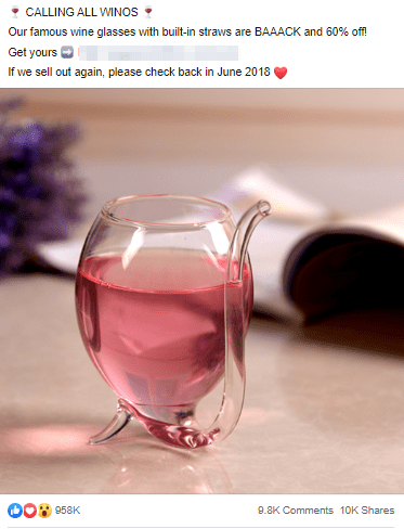 This advertisement has thousands of likes, comments and shares. The picture of this wine glass makes people focus on the product and helps them get a clear picture of how it’s going to embellish their homes.