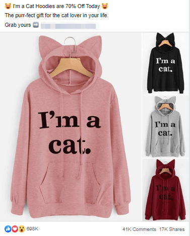 That’s why your Facebook ad should let customers see that they have various options to choose from. A good example of this is shown in the picture above. Those who don’t want to buy the pink hoodie can pick one of a different color from the alternatives on the right side of the picture.