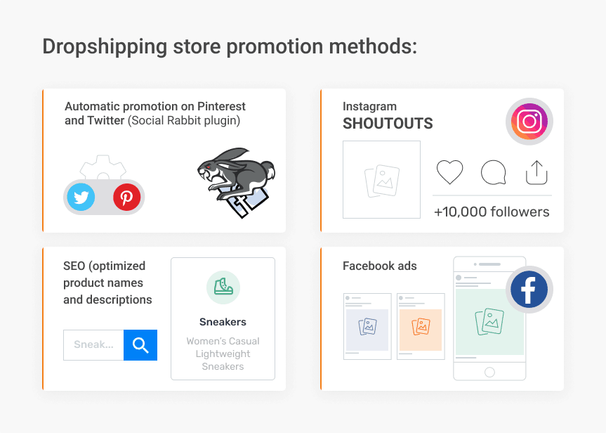 Facebook ads, Instagram. I also run Pinterest and Twitter, automated, brings a few sales now and then. SEO wise – it’s smart to do Your products properly with nice descriptions and names. I have good rankings in Google and it does help.