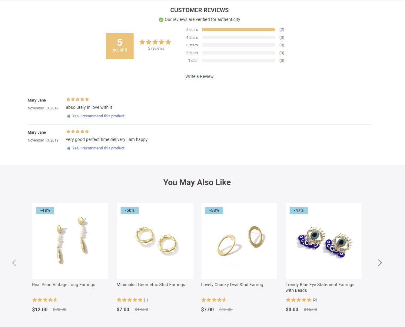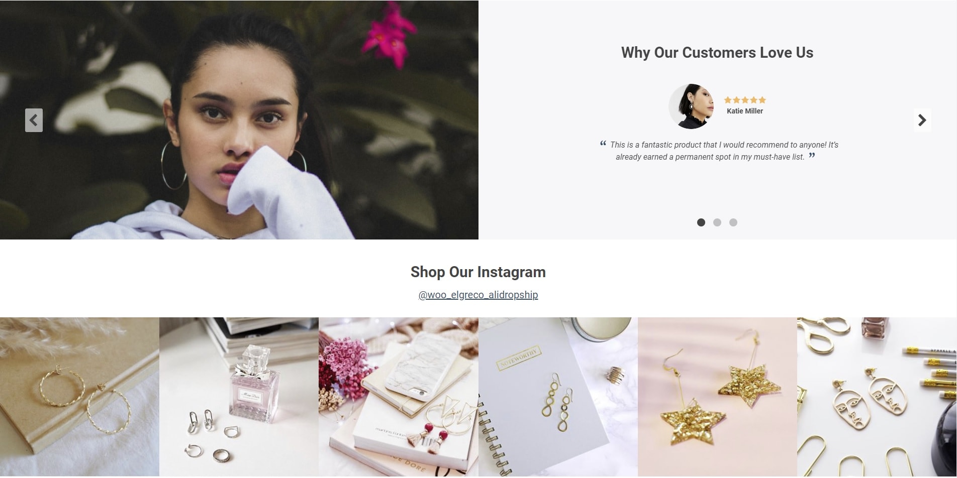 If you keep scrolling, you will see a social proof unit. Due to it, your store visitors will be able to check what your previous customers think about your products and store as a whole.