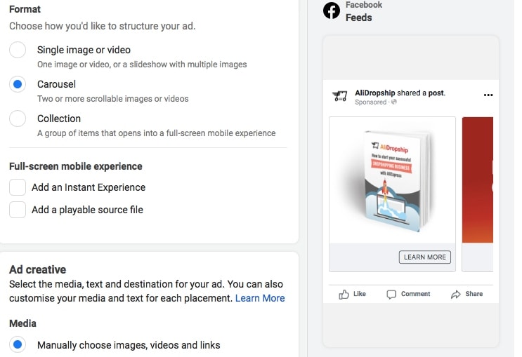 After picking a campaign type, you move on to creating ad sets and ad creatives. In the latter section, Facebook lets you choose between a number of options. Available ad types depend on what campaign objective you have picked. Usually you have at least one of the following ad types: