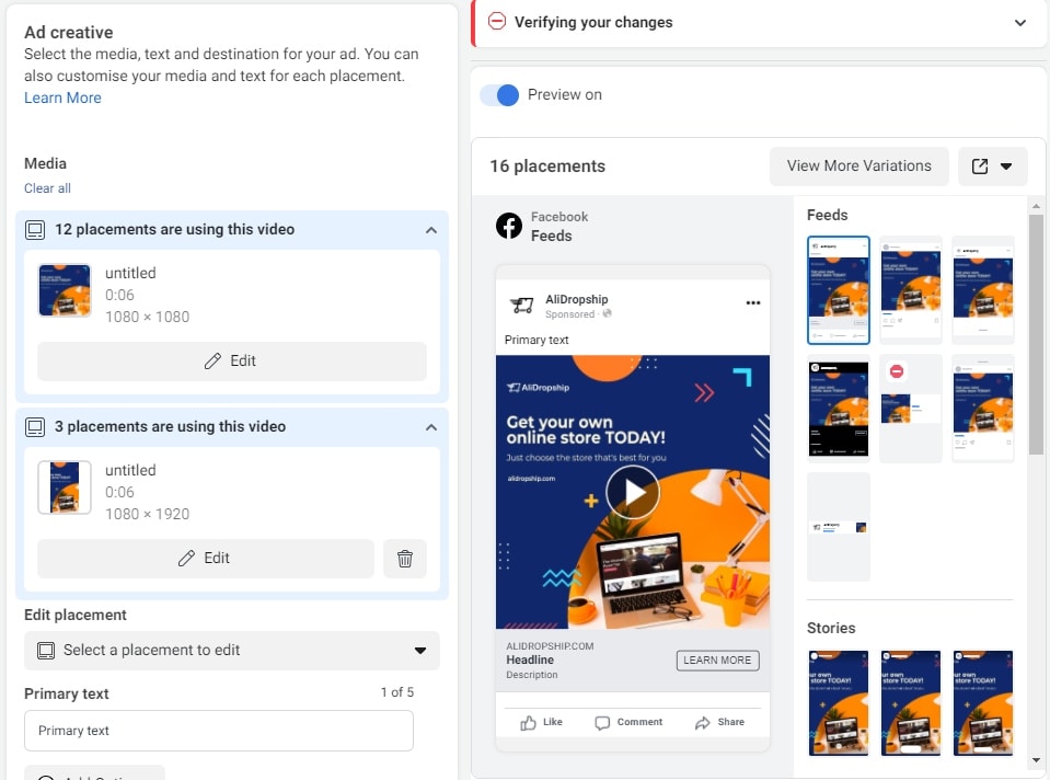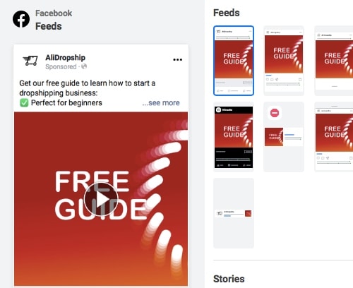 Facebook also lets you pick from a huge variety of sizes, with each suiting a particular placement type (i.e. where the ad will be shown). But our team recommends using the standard placement groups – square (1:1), vertical (9:16) and horizontal (1.91:1).