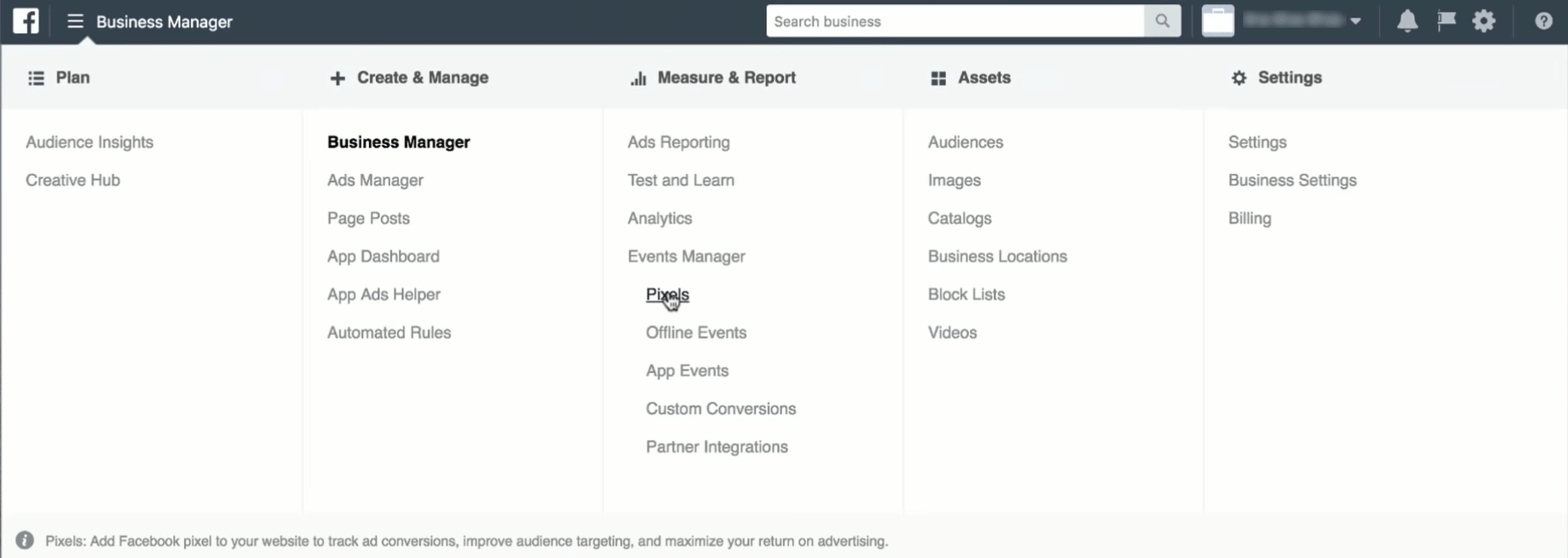 To start, you will need a Facebook Business account to access this function. Once that’s set up (or if you already have one), go to the Events Manager of your account and click “Pixels” under “Measure & Report.”