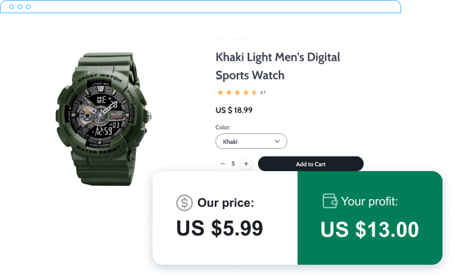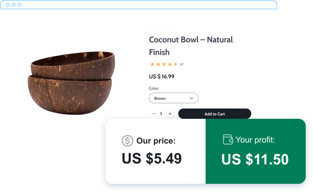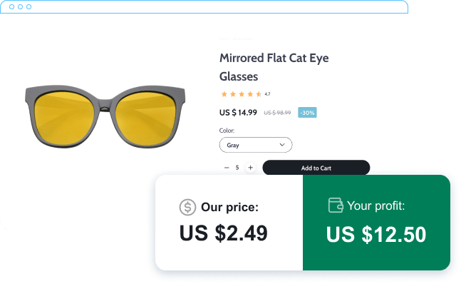 Import products from our catalog, set up the profit margins, sell products in your store, re-order them from AliDropship at the lowest price and keep the profits.