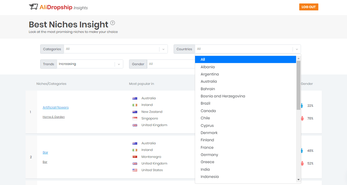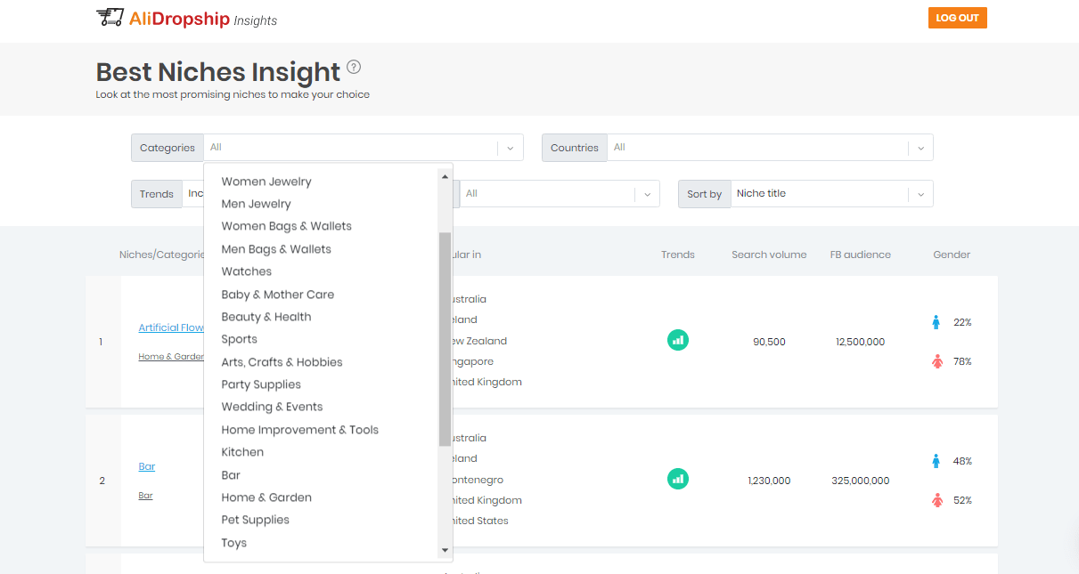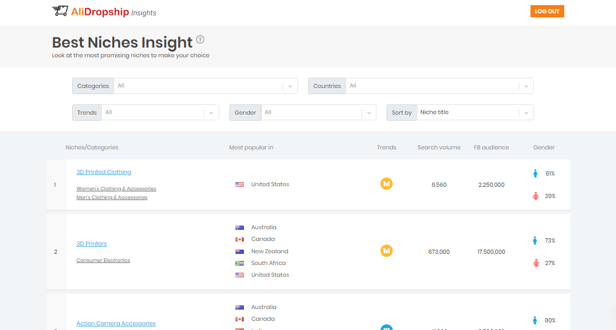 Best Niches Insight is one of the free sections of AliDropship Insights project. It gives you access to a profitable niches list to help you make a winning business choice.