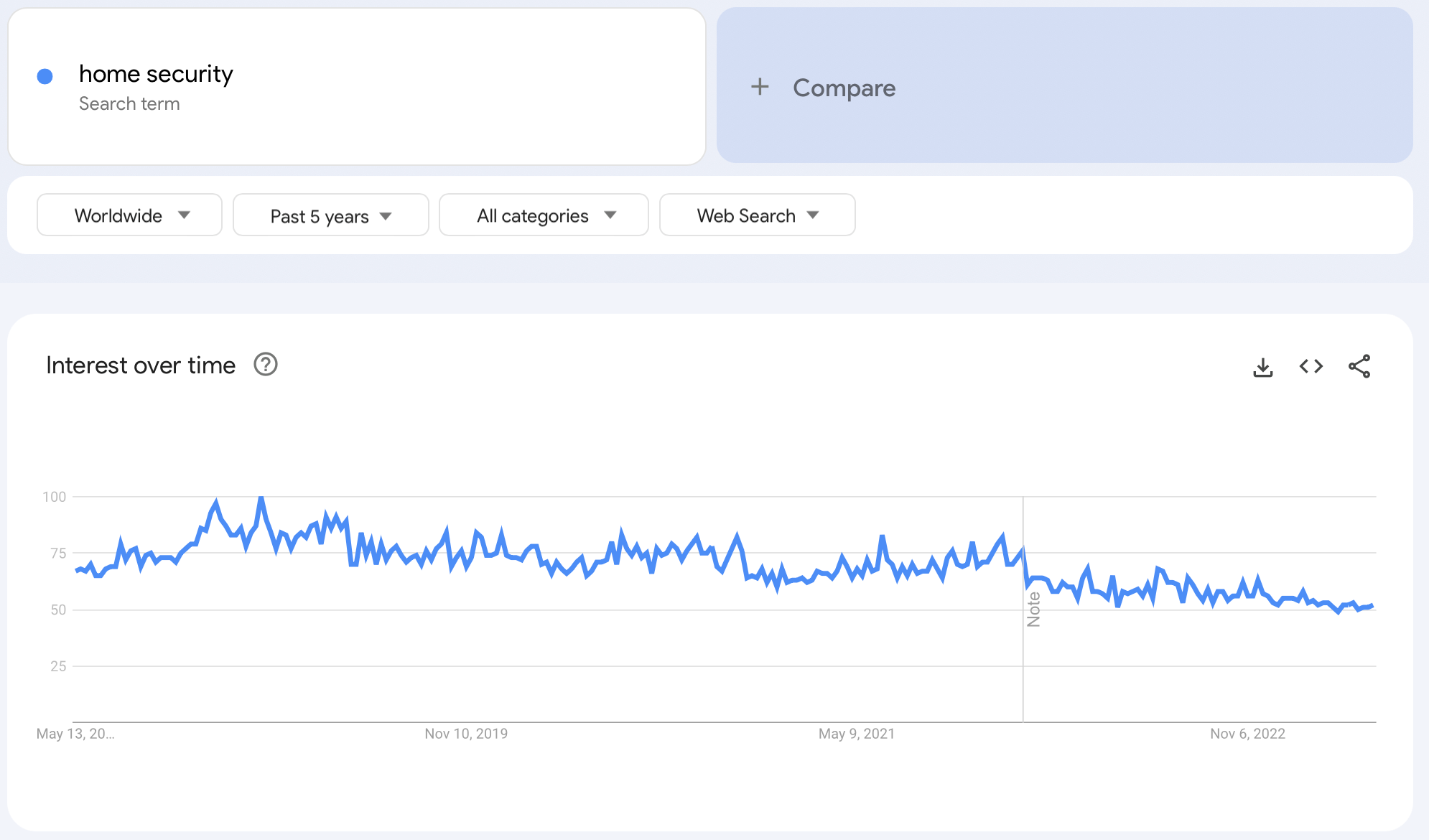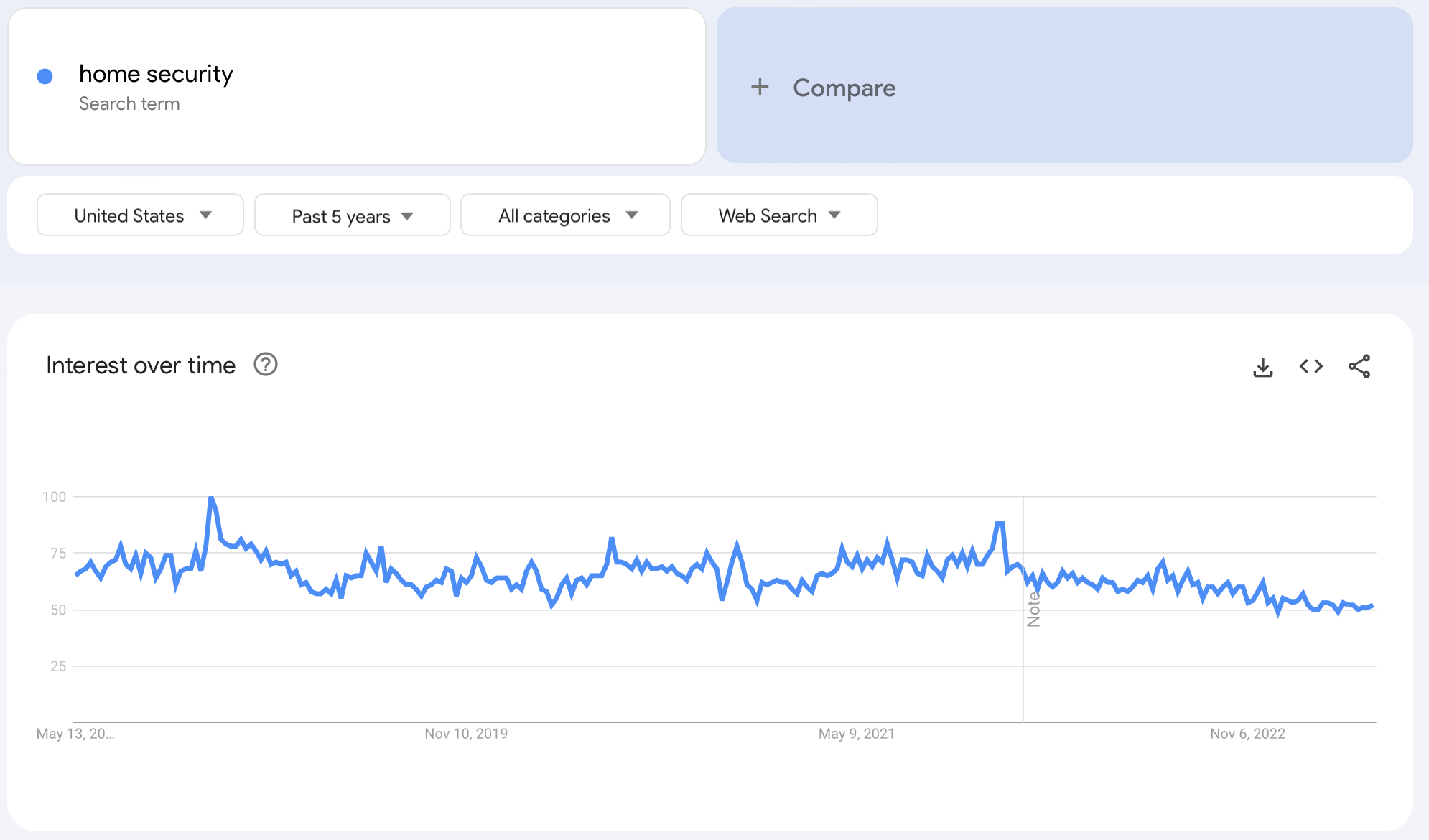 Analyzing Google Trends, home security is a rather popular search query and the demand has been steady over the last several years.
