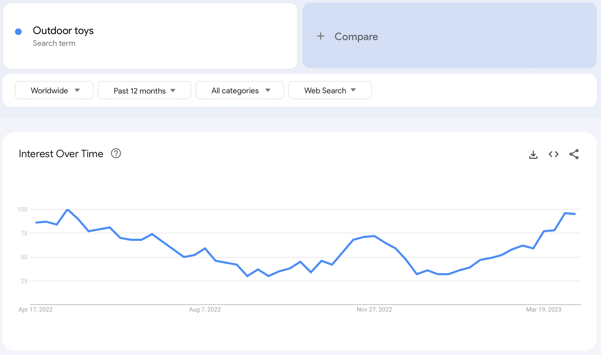 Outdoor toys are one more product that people wait for spring to order and let their children have some fun. If there are some doubts about it, look at the screenshot above: the demand for them is tremendous! So why not try to gain from them?