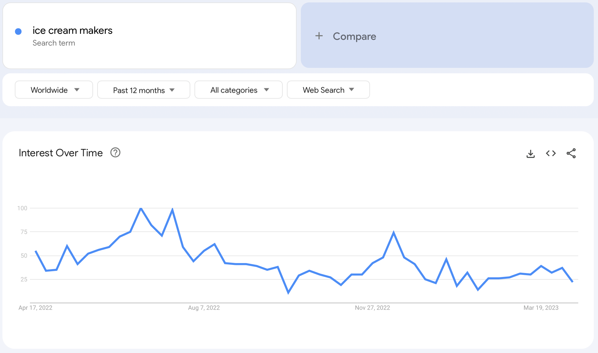 And this is proved by the Google Trends’ graph provided above: the interest towards ice cream makers has a peak at the beginning of summer. Well, this actually means this is one more product for your online store to add to your product range and try to make a fortune with.