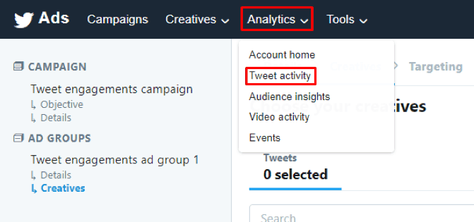 With this tool, you can easily evaluate the success of your Tweets. To do this, go to Analytics and click on the Tweet activity option.