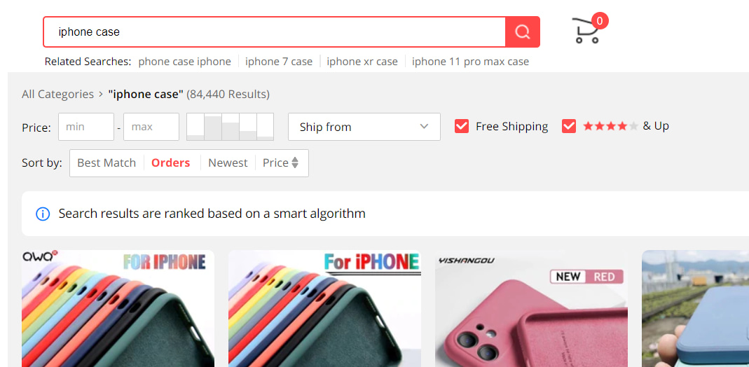 By searching for products to sell, you will also be able to find reliable suppliers. Whenever you type something in the AliExpress search bar, also tick ‘Free shipping’ and ‘4* & up’. Then sort the results by the number of orders.