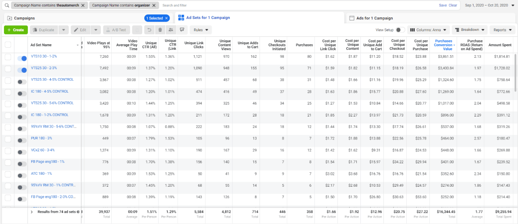 It depends on you heavily. You should understand how much time you’re ready to allow for the store promotion. In this particular case, up to 10 ad campaigns on Facebook are running simultaneously. Meantime, there are five and more ad sets added to each campaign, some of them are transferred to the other ones, some are turned off, etc.