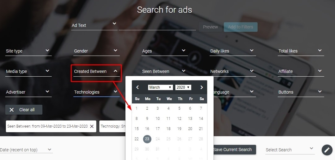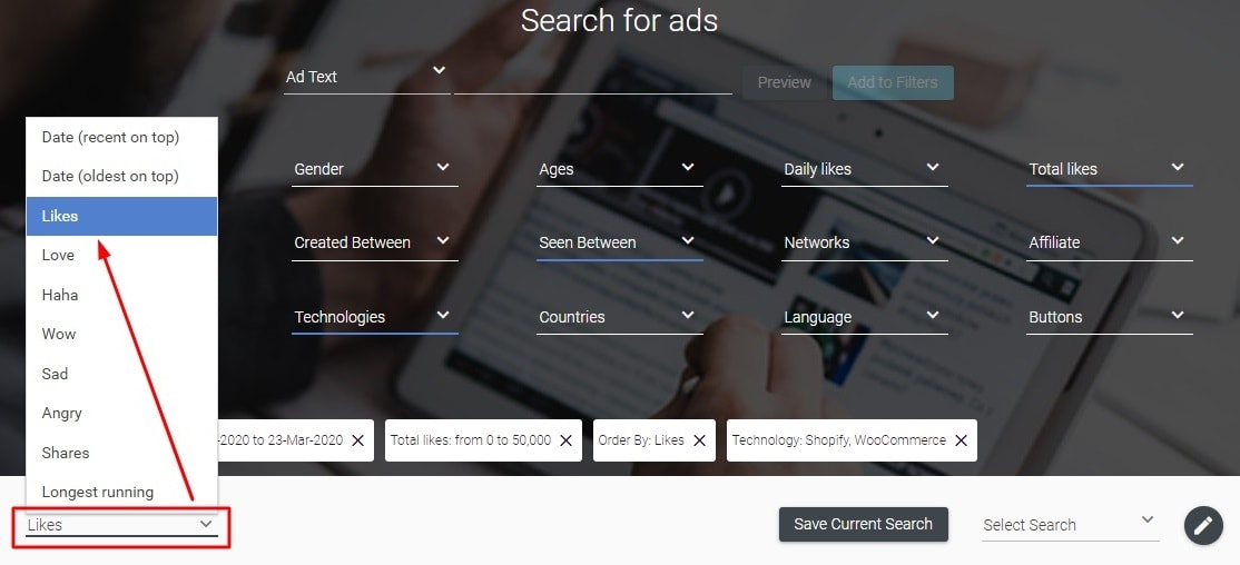 Then you’re supposed to see the most popular ads on Facebook for a particular period of time in terms of the number of ‘likes’. The list of ads shown is going to be extremely long. So be ready to scroll down for too long since the biggest part of the products from ads is highly unlikely to suit your store.