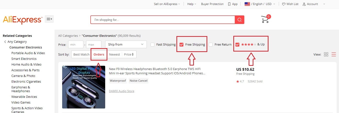 First of all, you need to choose a niche you’re interested in. Then, proceed to the type of products you are going to sell in your online store. At the next stage, it’s necessary to use search filters: free shipping and 4 stars & Up. And don’t forget to sort the results by the number of orders.