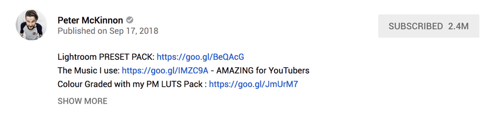 For example on Peter Mckinnon’s channel, he sells his own LUT packs and presets – which you can see in the description of his videos. These are $20 a pop. And each of his videos gets a few hundred views. I think we can safely assume he is making an easy six-figures/year from that alone.