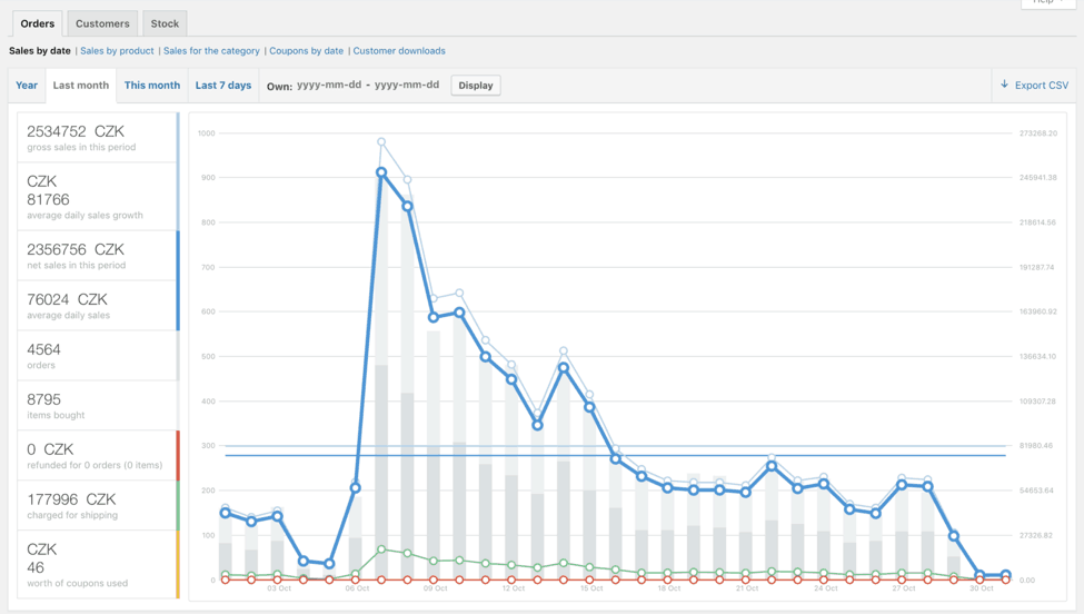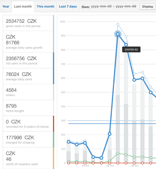 On September, 7th, we had 480 sales (while our average daily number of orders is 152), and our gross sales revenue was 249,190 CZK – or $10,918.26.