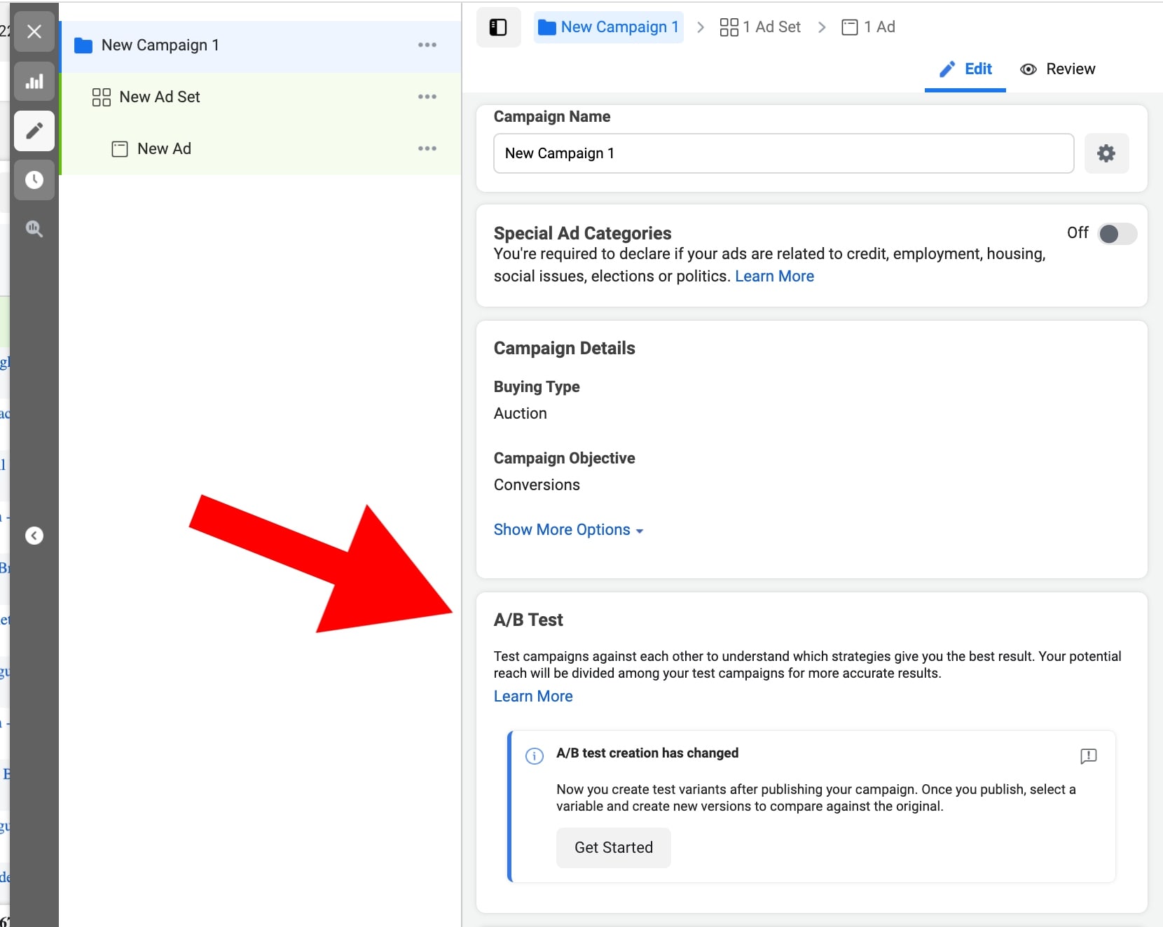 After choosing a type of campaign, Facebook will ask you to customize the settings. One of the fields there is named “A/B Test”. This is what you need. Simply click on the “Get Started” button and continue customizing the campaign structure.