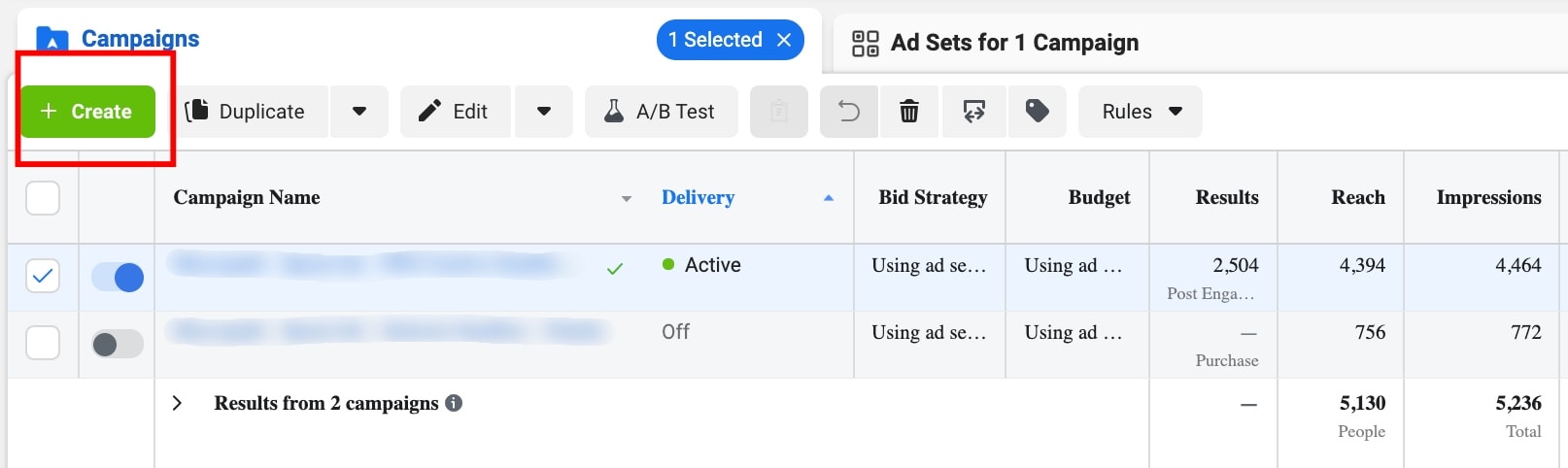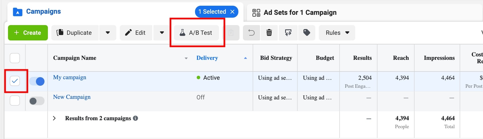 Another way to launch an A/B test on Facebook is to tick a box near a desired ad, ad set or campaign and click on “A/B Test” on the panel.