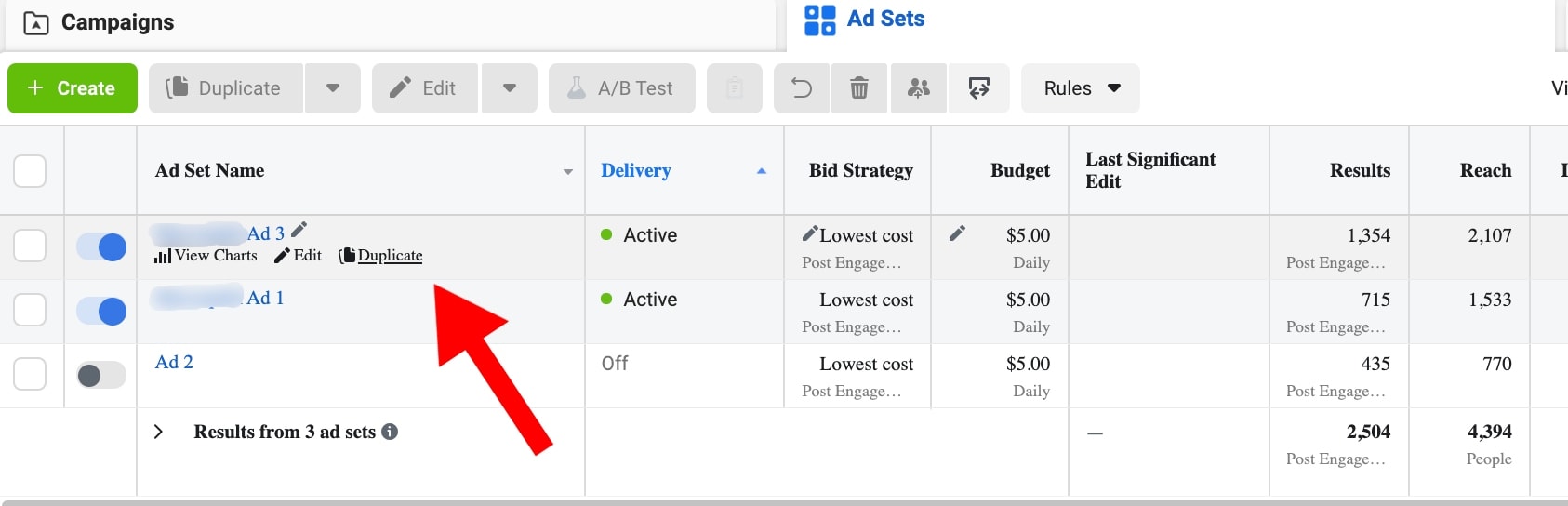 In order to run A/B tests on Facebook for ads and ad sets, you need to have an existing campaign. Pick an ad or an ad set and click on “Duplicate” under its name.