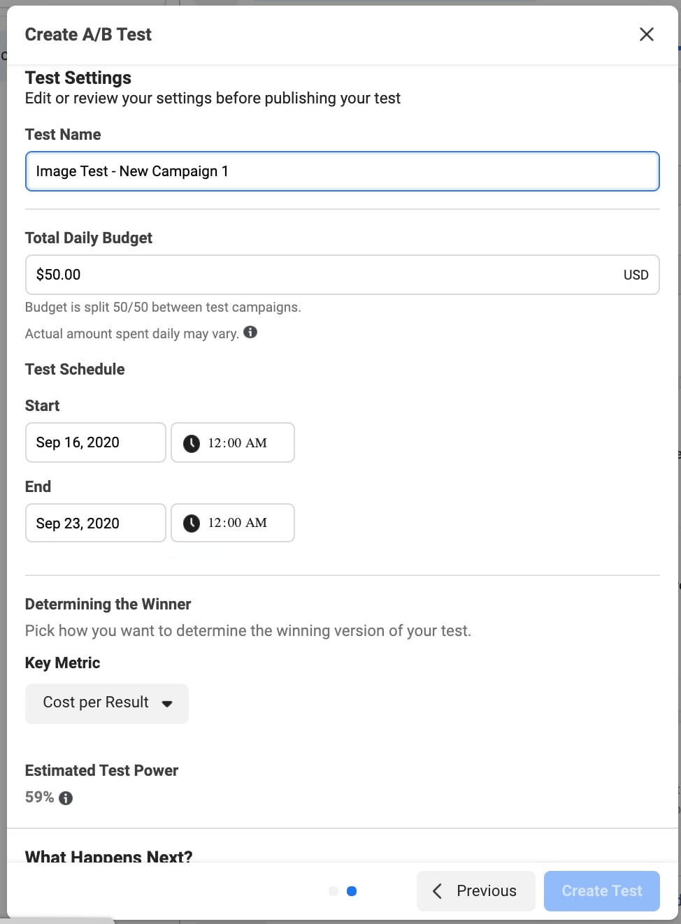 As for the “Estimated Test Power” index, don’t take this information too seriously as Facebook’s estimations are pretty vague.