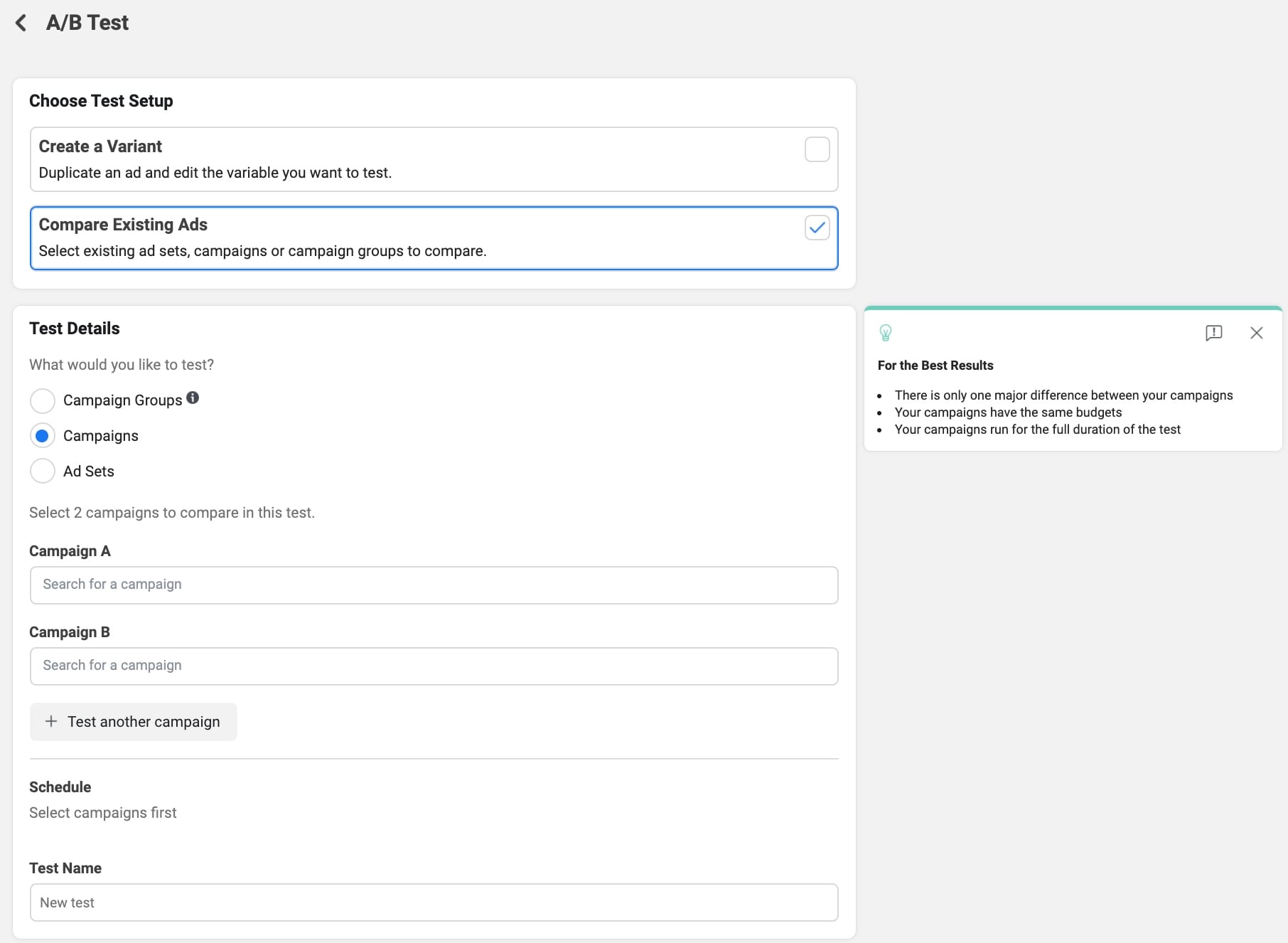 - Saved Audience (will compare identical campaigns targeted at different audiences)