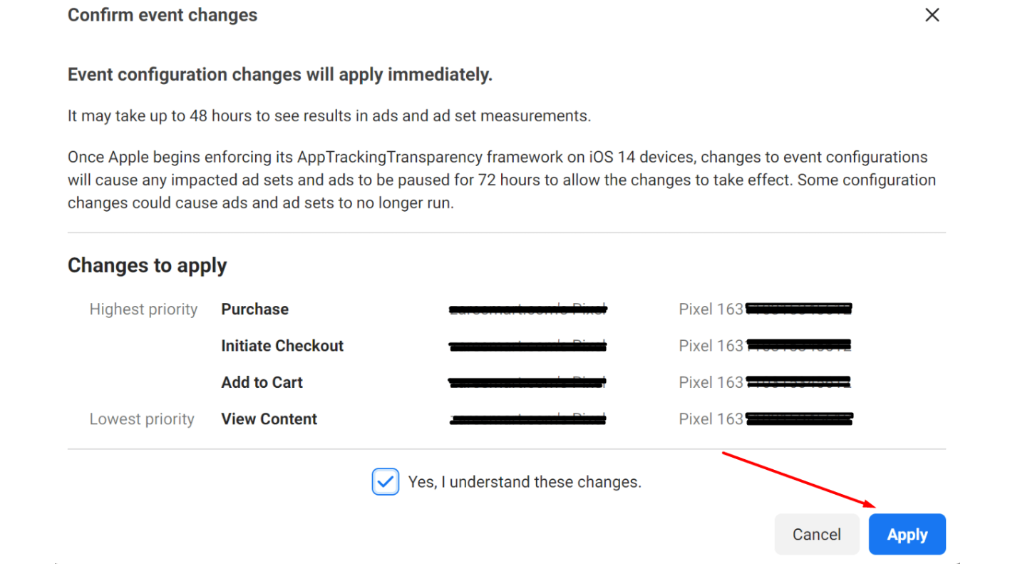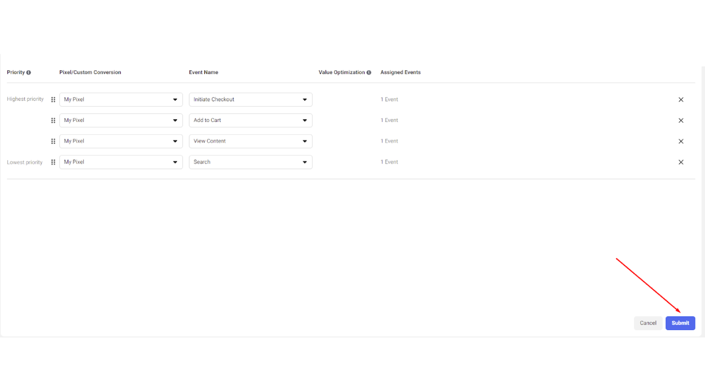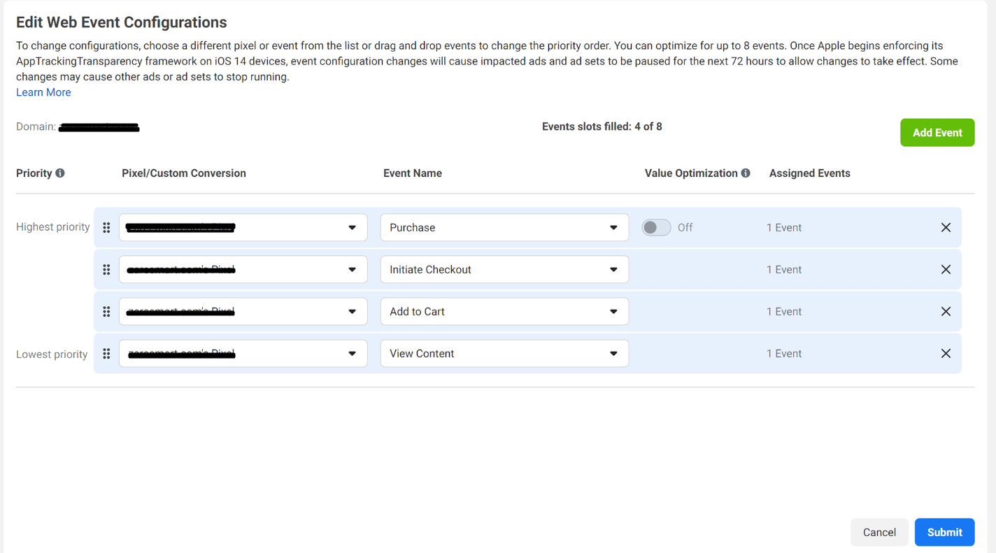 Add 4 events and place them in this order: View Content > Add to Cart > Initiate Checkout > Purchase (from lowest to highest). The lowest events are of the lowest priority and the highest – of the higher priority.