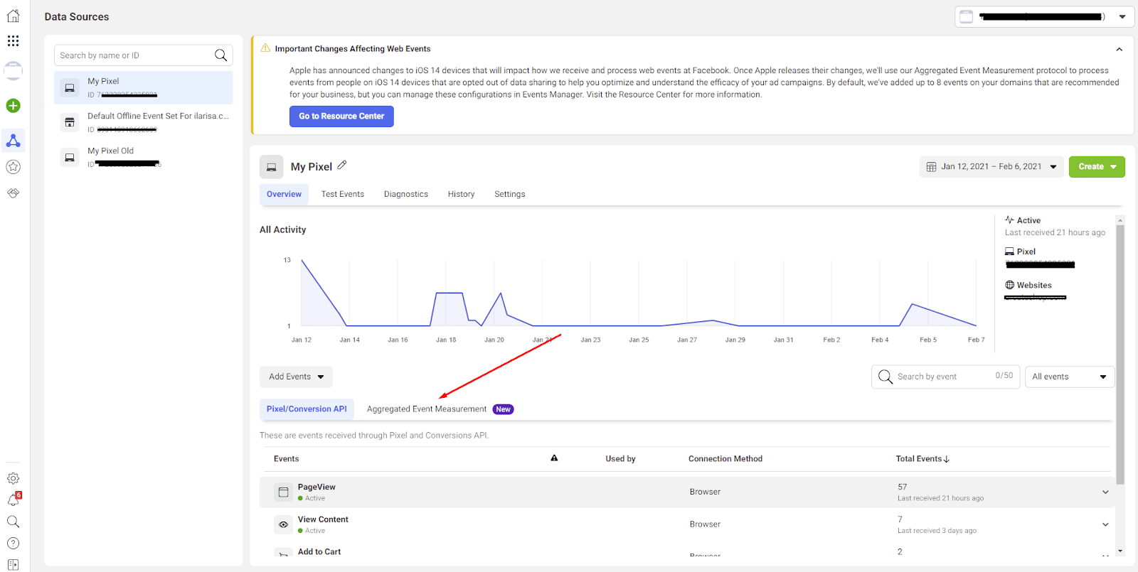 Go to Facebook Events Manager, choose your store’s Pixel there and click “Aggregated Event Measurement”: