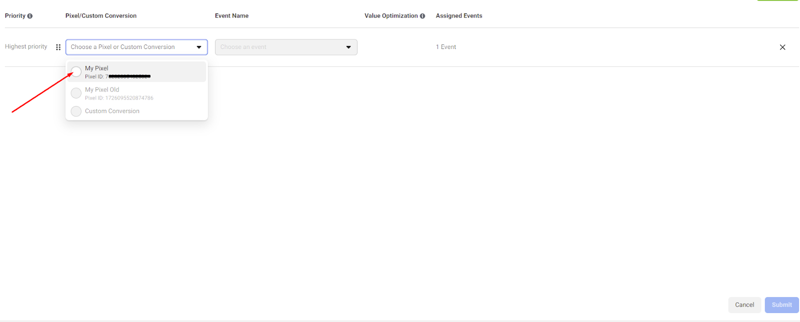 Very important! Choose the correct Pixel (the one you use in your Facebook Business add-on/on your site):