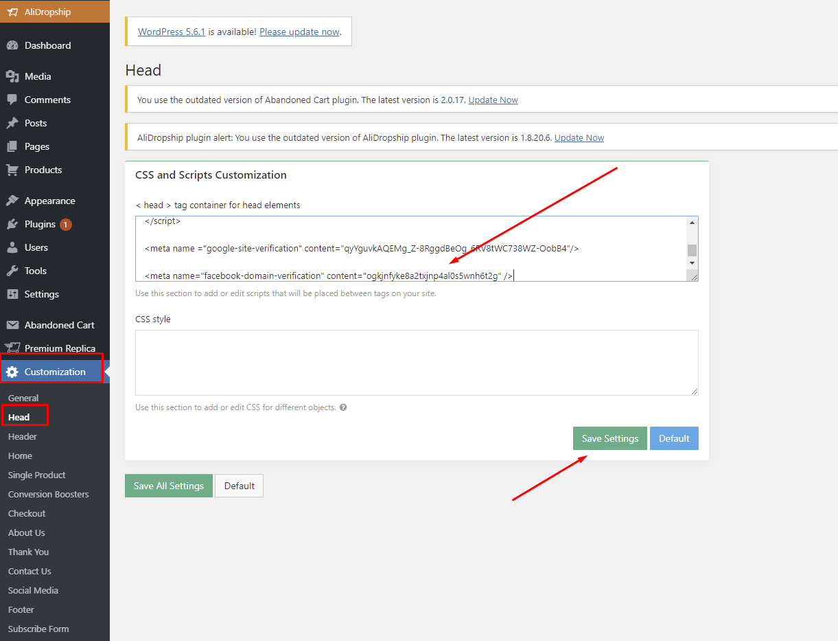 Then, go to your WordPress admin area > Customization tab > Head field. Paste the code and click “Save”. If you already have a Google Analytics tag there, just insert the domain verification code below and click on “Save”: